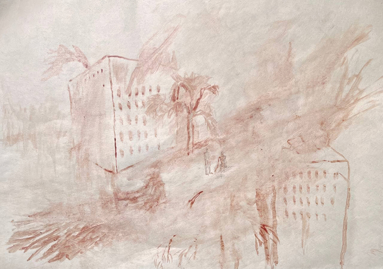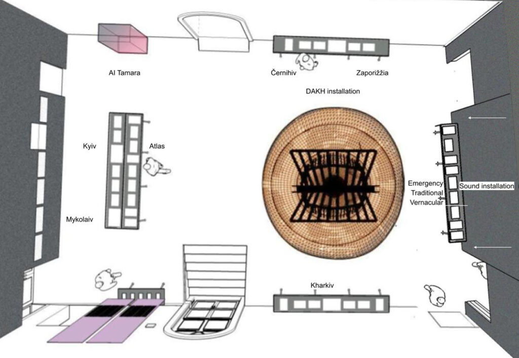 The exhibit consists of six elements: DAKH; an AI avatar of Tamara Kosmina; a selection of materials from the archive of the Atlas; documentation of emergency vernacular landscapes of war and repair in Chernihiv, Kyiv, Kharkiv, Sumy and Zaporizhzhia regions by reconstruction collectives Livyj Bereh and KHARPP; Places: Mykolaiv Region, a photographic exploration of war-dehydrated landscapes; and the Drone Canopy: a sound installation merging the music of Drones for Drones, a fundraising compilation series, with the power of Klyn, a grassroots drone-building project.