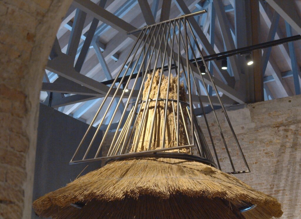 The core element in the exhibit is DAKH—a dynamic pre-image of a vernacular Ukrainian roof, conceived by architect and artist Bogdana Kosmina. The form, structure, materiality and spirit of DAKH emerge from The Atlas of Ukrainian Traditional Housing, a 50-year monumental research project carried out by three generations of women architects: Tamara, Oksana and Bogdana Kosmina.